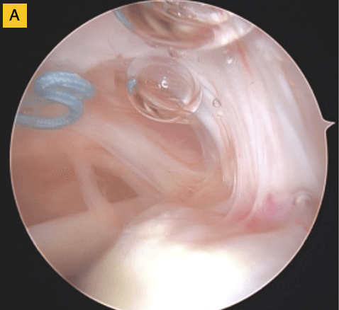 (A) Tendon fibers can be seen inserting on to footprint in an organized fashion. Visible, prominent suture easily removed.