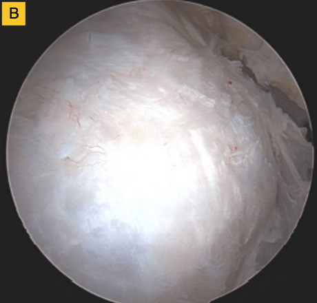 (B) BioBrace® well-synovialized and completely incorporated into the rotator cuff with new native tissue in and around the implant.