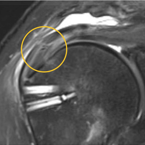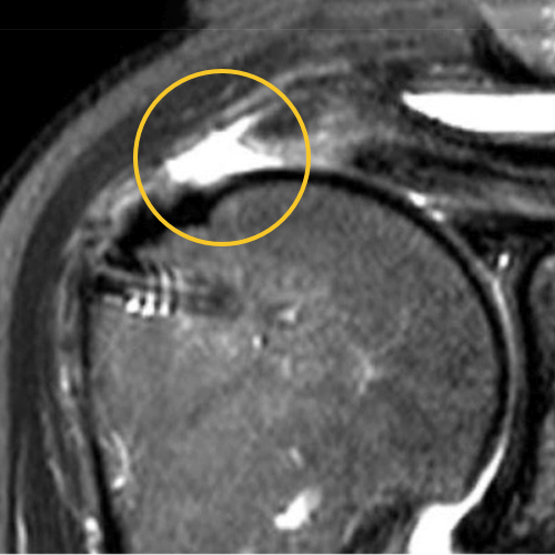 We published this case study in the JOEI (Journal of Orthopedic Experience and Innovation) Journal. We did a revision of the large type-II repair and augmented it with BioBrace®. You can see the pre-op and three-month MRI below. Still fluid in the subacromial space but that tendon is clearly coming across into the footprint. Then, an eight-month MRI shows there's no further fluid in the subacromial space and maturation of that repair across the footprint.