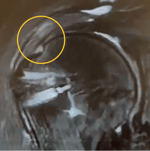 This is one of my cases, a 55-year-old woman, when her primary rotator cuff repair was done, we used Dermis on Demand, which is an allograft skin that can be utilized to help strengthen repairs. At four months out, the patient presented with pain and weakness following a traumatic injury and wound up re-tearing.